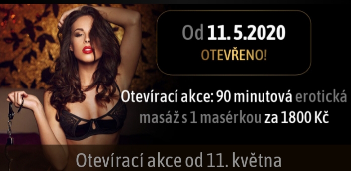 Milí klienti. S radostí Vám oznamujeme, že náš salón bude od 11. května 2020 znovu otevřen. Akce 90 min erotická masaž s 1 masérkou 1800,- Můžete se tešit na nové masérky příští tyden nové fotogalerie 😉